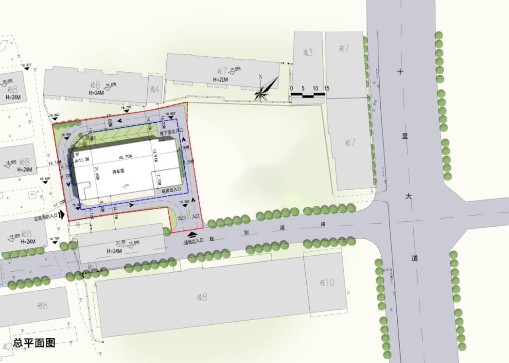規劃條件:用地性質為社會停車場用地,容積率≤2.2,建筑密度≤70%,機動車位不少于88個。該處擬建一棟地下二層、地上三層立體停車樓,建筑高度11.3米,泊位94個,所報規劃方案的相關指標均符合規劃條件和國家法律法規相關要求,經專業咨詢機構日照分析,建設后基地內和基地外日照時數均滿足國家規范要求。