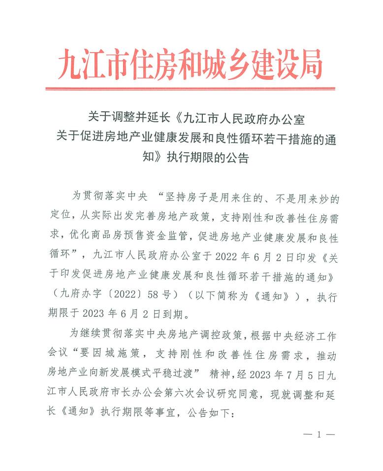 為繼續貫徹落實中央房地產調控政策,根據中央經濟工作會議“要因城施策,支持剛性和改善性住房需求,推動房地產業向新發展模式平穩過渡”精神,經2023年7月5日九江市人民政府市長辦公會第六次會議研究同意,現就調整和延長《通知》執行期限等事宜,公告如下: