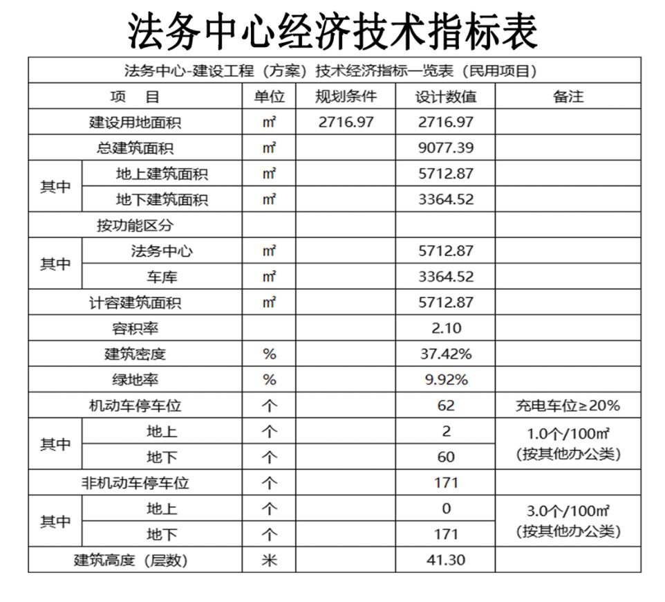 法務中心項目概況:規劃用地面積2716.97㎡,擬建建筑面積9077.39㎡,容積率2.10;